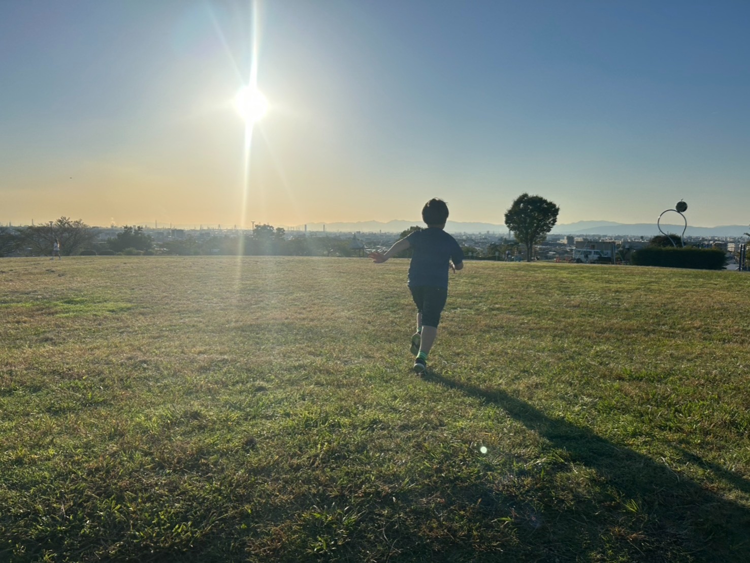 やけに太陽が綺麗でしたので一枚写真でもと思い撮ったところ、たまたま遊んでいた子供たちが走り出してその中の一人が通りかかったのです