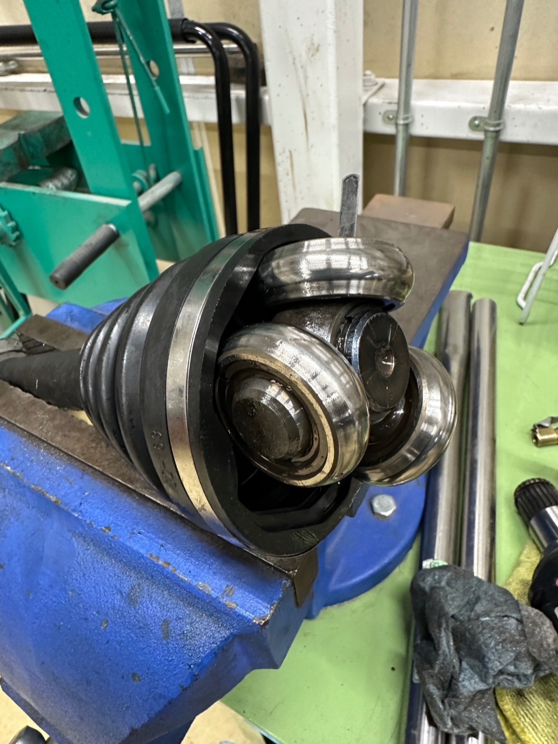 万力にドライブシャフトを挟み、先端についているCリングを外してベアリングを外して新しいブーツを嵌め込みます!